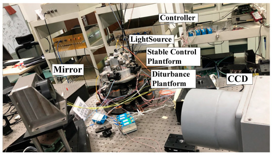 Two motion platforms superimposed the experimental system. The lower platform was used to simulate the platform disturbance while the upper platform was used to stabilize the laser light. The inertia-stabilized platform was equipped with MEMS gyroscopes and MEMS accelerometers. Inside the platform, the MEMS accelerometer was the feedback component of the acceleration loop and the MEMS gyroscope was the feedback component of the velocity loop. The CCD acted as a position loop sensor to detect the position signal of the beam. The sampling frequency of the CCD sensor was 100 Hz, with a hysteresis of two frames, while the sampling frequencies of the MEMS accelerometer and the MEMS gyroscope were both 5000 Hz.