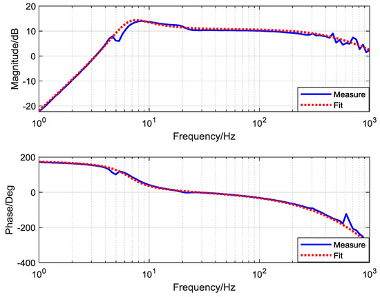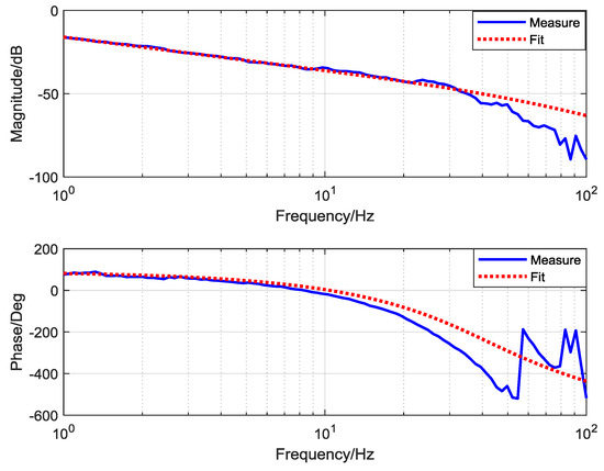 The design of the disturbance compensator of the acceleration loop was the same as before. The design of the position loop disturbance compensator also needed to estimate the model of the position-controlled object. By sweeping and fitting the position object in the 1 Hz–100 Hz frequency band, the results were obtained as shown as Figure 10.