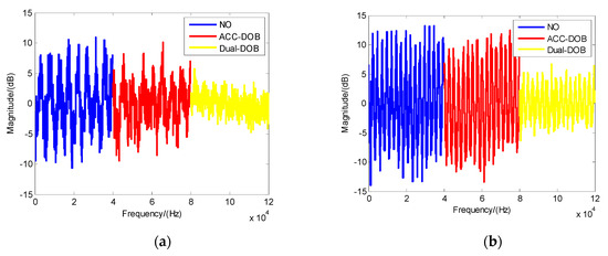It can be seen from the Equation (22) that the improvement in the disturbance rejection capability of the dual disturbance observer mechanism is mainly related to the design of the disturbance compensator and . Therefore, we discussed the disturbance rejection capability of the acceleration ring’s and the position loop’s disturbance compensator separately. Suppose that the disturbance rejection functions of the acceleration loop and the position loop, respectively, are: