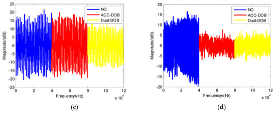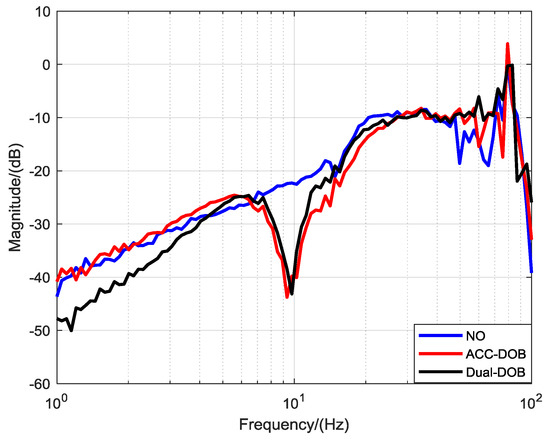 The designed dual DOB was used to verify the disturbance rejection effect on the experimental platform. The obtained system disturbance rejection characteristics are shown in Figure 12.