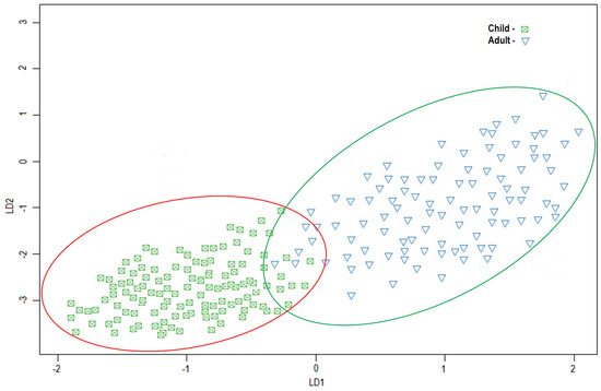 Linear Discriminant Analysis (LDA) applied to the dataset divided into two age groups.