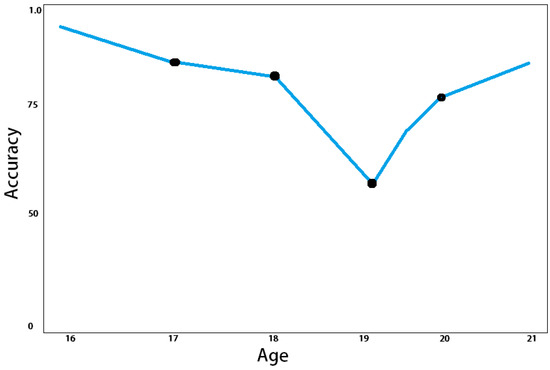 To test the performance of our proposed system, six age groups are chosen that have nearly similar auditory perception responses. The classification performances for the age range of 16–21 years are shown in Figure 5. For this experiment, 17 subjects conducted the test with 10 repetitions. The classification rate for all subjects (16, 17, and 19–21) using random forest classifier shows acceptable results as compared to the subjects of 18 years old. The performance of the system for the subjects of age 18 years is nearly 65%.