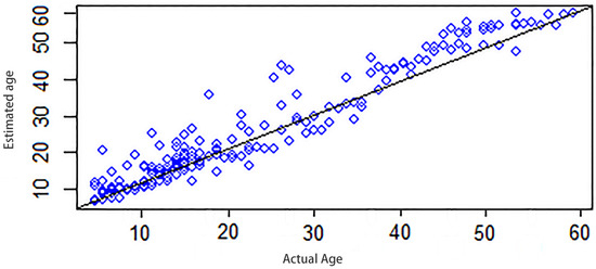 The scatter plot of the known actual verses predicted age and overlay of line y = x are shown in Figure 6. If the model predicts the age perfectly, then all the data points would lie on this line. There are only a few outliers that do not fit well on the line, with a few years of difference. It can be seen that, below 20 years, the data points lie perfectly on the line. Therefore, our approach is able to predict the age of a child with high accuracy.