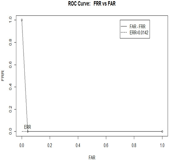 The objective evaluation shows how much the results and the references are determined as the same person by using auditory perception. To evaluate the performance of the system, volunteers of different ages and genders have tested our designed system. For real-time evaluation, the regression model trains the model with the reference database and tests the model with a volunteer’s data that does not exist in the database of the system. This evaluation checks the likelihood that the volunteer belongs to the same age class, and then, the similarity is evaluated based on the accuracy and the thresholds. While handling a biometric system, objective evaluation techniques are based on two factors: the FAR (False Acceptance Rate), which is calculated as a fragment of impostor scores overshooting the threshold, and the FRR (False Rejection Rate), which is calculated as a fragment of genuine scores falling below the threshold. There is no admissible way to determine if a system with a lower FAR and a higher FRR value performs better than a system with a higher FAR and a lower FRR. Therefore, the equal error rate (EER) of a system can be used. The more minor the value of EER, the better the performance of the system. The ROC (Receiver Operating Characteristic) curve is created in order to choose the prime threshold; we obtain 113 genuine scores and three impostor scores through some volunteers of different ages and genders. By considering the definition of FAR and FRR, the value of EER can easily be calculated. The ROC curve for our proposed model after testing is shown in Figure 7. It is concluded that the system’s performance is quite satisfying; hence, the EER is 1.4%. However, it is obvious that the performance can be affected by changing the standardized parameters (distance from the computer, using headphones or speaker, and sound intensity), and hearing loss is also a factor that can affect the results.