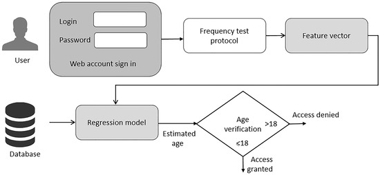 In Figure 8, it is explained how a user can create an account on our online web interface. It requires some data to be inserted manually such as email address, name, and password. After successful creation of an account, on the login page, an age verification step is presented to give access rights to users less than 18 years old. The subject takes the test by listening to the sound and by pressing the “enter key” when they stop hearing the sound, while for the second test, the subject should press the “enter key” when the start hearing the sound. The corresponding frequency is registered in the databases. The regression model is used to predict and estimate the age of the subject. If the estimated age of the subject is higher than 18 years, then the access will be denied, and if his/her age is lower or equal to 18 years, the account will be created for further use.