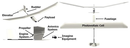 The UAV adopts a normal configuration, without landing gear and aileron, and the wing adopts a lightweight structural design with the PV cells cover the upper skin. Besides, the imaging equipment is mounted on the nose in order to get a wide field view as well as avoid touchdown collision, and the engine system is placed on the rear side of the wing to generate thrust, as shown in Figure 2.