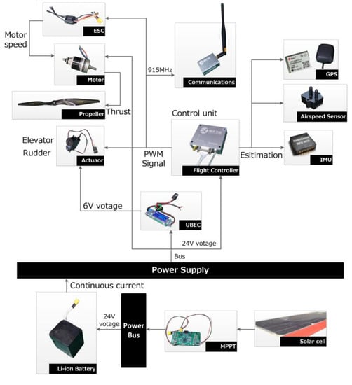 The system topology of the UAV is shown in Figure 3, and it can be divided into energy and flight control systems. The flight control system is located above the power bus, which consumes power for autonomous control, and the energy system is located below the power bus, which is composed of PV cells, maximum power point tracking (MPPT), and batteries for energy collection, consumption, and storage.