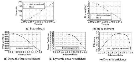 The above experiment is carried out at a low altitude, but the UAV is intended to fly at high altitudes. Therefore, it was assumed that the propeller thrust and power coefficient did not change with altitude, and the calculation of high altitude propeller thrust and power was achieved by density change [15]. The nonlinear relationship between the static thrust and moment is shown in Figure 5a,b, and the dynamic thrust and moment are calculated based on the relationship between the advance ratio to the thrust and power coefficient, as shown in Figure 5c–e.