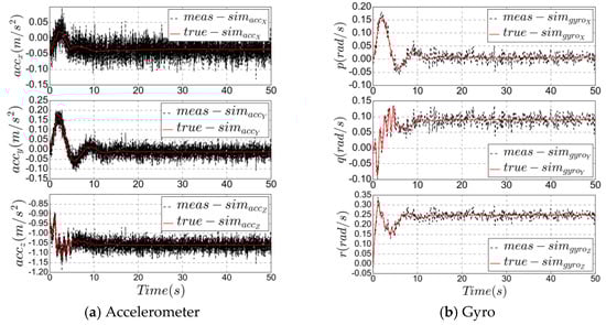 where the subscripts m and f represent the measured and filtered data. The measurement noise and bias of the IMU are shown in Table 12, and the error and noise in Table 2 are the same in the xyz direction, but the acceleration in the x direction and the angular velocity in the y direction are obviously greater than that of the other two directions, and the noise in the corresponding direction is also greater. With the increase of altitude, the noise increases and the deviation decreases, which can be regarded as a function of altitude and airspeed, but the sensor bias is almost constant and it can be regarded as a function of temperature.