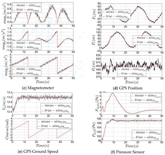 Figure 6a,b, which is the Inertial Measurement Unit (IMU) simulation, where the accelerometer measurement is a high-frequency signal and the noise of low-cost sensors is obvious; (c) is a magnetometer, the measurement is a medium-low-frequency signal; (d,e) is GPS; and (f) is the pressure sensors’ simulation, as low frequency as GPS, refer to Table 4. In the dynamic process, the measurement is consistent with the trend of the true signal, and when entering the steady state, the measurement noise is large, and there is a significant deviation.