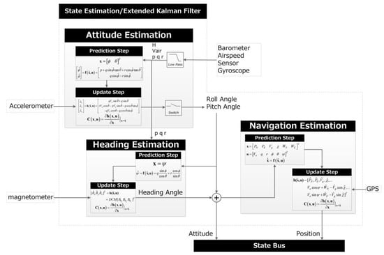 After obtaining the measurement data of the sensor, a dynamic observation of the raw data is necessary for low-cost hardware. Extended Kalman Filter (EKF) theory is a suitable method for the poor computing power of a low-cost flight controller, which has been widely used in various open-source flight controllers [20], and different EKF structures are derived according to different sensor combinations; for example, there is no magnetometer or more angle of attack and sideslip angle sensors [21]. The UAV adopts the EKF structure algorithm for state estimation, which consists of prediction and update steps, and the state equation and measurement equation for nonlinear discrete dynamical systems can be written as