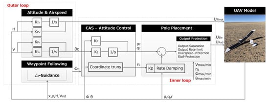 For the low-cost solar UAV, the flight control architecture emphasizes simplicity, robustness, and low-power consumption to fulfill the need for a reliable long-endurance automatic flight. Thus, the structure of the control law is designed by using the longitudinal and lateral separated cascaded proportional–integral–derivative (PID) controllers, as shown in Figure 8. In the outer loop, the flight controller employs a nonlinear guidance law to track waypoints by generating the command roll angle. Altitude and airspeed control are provided by a proportional–integral (PI) structure, command pitch angle, and throttle as output [22].