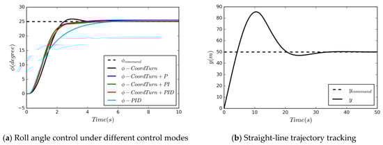 The five roll attitude hold simulations comparison and straight-line path following are shown in Figure 9, and the UAV starts with a given trim state, in which the roll angle command is 25 degrees and the command path is from (0, 50) to (1000, 50). The roll angle command can be quickly tracking due to the absence of direct control of the ailerons, while the lateral trajectory tracking response is slow, but it still can be used in practice.