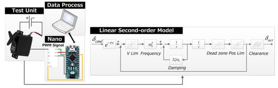 The UAV adopts a digital actuator as the only driving mechanism of its aerodynamic surface to generate control force and moment, since the response time of the actuator is generally much smaller than its time constant. In the initial stage of the controller design, the influence of the actuator can be ignored. However, the dynamic response of the actuator will affect the actual control process in the flight test stage, and the slow response of the servo may cause the entire system to diverge, so the response characteristics of actuator must be considered [24]. In the simulation, the dynamic process of a digital actuator can be regarded as a linear second-order model, with the effects of the dead zone, saturation, clearance, and communication delay [25], and the damping and frequency characteristics are still need to be measured experimentally. The dynamic performance test experiment of the actuator is completed in this paper, as shown in Figure 10, and a sweep frequency function is input through the Nano system.