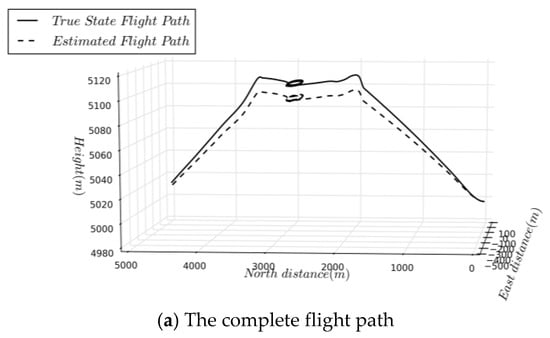 In the numerical simulation, the conditions are set according to the plateau environment conditions during flight test, a typical mission route was used, and the flight time was December 21, 2018, at 10:57, with an altitude of 5000 m, a mission height of 100 m above the ground level, a temperature of 0 °C, and no wind. The initial capacity of the battery was 70% of the maximum capacity, and the estimated state was used as feedback. The simulation results of the flight path, position, and attitude of different phases are shown in Figure 11, where the estimated state is indicated with a dashed line, and the true state is indicated with a solid line for comparison.