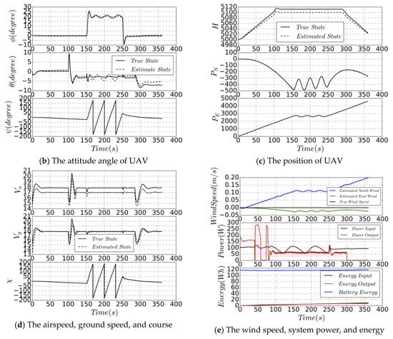 Figure 11a shows a comparison between the estimated and true flight trajectories. Since the altitude and airspeed are only low-pass filtered, the static bias of the altitude is 12 m, and the airspeed bias is 1 m/s, as shown in Figure 11c,d. Figure 11b shows the change of the attitude angle, 150–250 s is the phase of the hovering mission, the roll angle error range is 3 degrees, and the pitch angle is 2 degrees, which makes the hovering trajectory fluctuate slightly, but the trajectory tracking process remains stable. Figure 11d,e shows that 8 m is a reliable estimation of the heading angle, ground speed, and wind speed ensuring the low-cost platform has a sufficient position accuracy with the trajectory tracking accuracy. The above results show that the accuracy of the longitudinal parameters has less effect on the mission trajectory, while the attitude and heading will have a direct impact, and the attitude angle changes obviously when the state is switched, such as climbing transfer to cruise state, but the position parameters such as ground speed and heading angle remain stable. Besides, the accuracy of the estimated states is shown in Table 7 with the precision sequence in the reverse of the state estimation stages i.e., “position > wind speed > heading/ground speed > attitude > altitude/airspeed”. In addition, as shown in Figure 11e, the input energy is slightly greater than the output, the battery is in a balance of charging and discharging, the maximum output power during the climb is 280 W, the cruise power is 64 W, and the energy output will increase obviously during the state-switching process. Therefore, it is possible to increase endurance by reducing state switching in a complete mission.