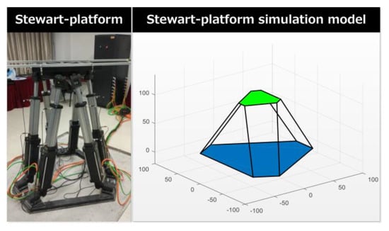 HILS is an effective way for the implementation of advanced control law to hardware, which bridges the practical real-time control and the numerical simulation together [27]. Compared with the three-axis motion platform, SP is more open and has a greater advantage in load capacity and space, the UAV can be directly fixed to the platform for a complete HILS experiment, and the platform can perform 6-DOF motions to realize the coupling of linear and angular motion. In this paper, three experimental motion modes are proposed including attitude, angular velocity, and acceleration to test different dynamic characteristics. The Jiwang Mechatronics Company (JWMC)’s motion platform and simulation model used here are shown in Figure 12, and its motion limitations are shown in Table 8.