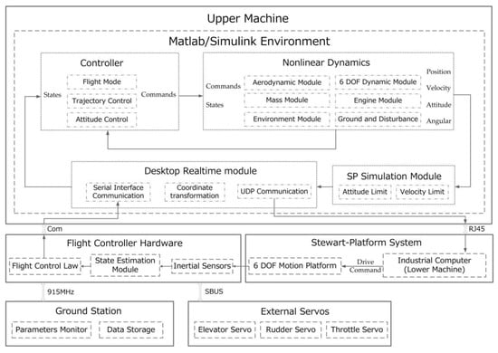 The SPHILS system consists of an SP, upper machine for simulation preset, lower machine for model calculation, industrial computer for motion platform drive, in which the flight controller receives the measurement information output control command, and the ground station receives real-time information and sends instructions. This co-simulation system can be used to verify the feasibility of the control system, calibrate the sensor and filter algorithm, and reproduce the typical flight mode. Figure 14 shows the system structure of the SPHILS, which can be divided into three layers: simulation environment, hardware, and output. The real-time simulation environment is built in MATLAB/Simulink, and the upper machine is embedded with a complete system including a controller model, nonlinear dynamics, desktop real-time simulation module, and the SP model. The hardware layer consists of a flight controller and SP, and it communicates with the simulation system through RJ45 and COM ports to express motion. The ground station and external servos are the output layer and obtain the measurement parameters and control commands.