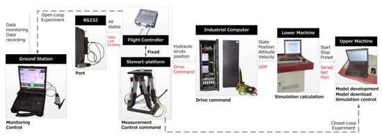 Figure 15 shows an open-loop and a closed-loop experimental scheme of the real HILS system. The open-loop experiment is a process from the upper computer to the ground station, which is a unidirectional structure and tests the limit states in the process of simulation, such as acceleration and angular velocity exceeding the limit, and it also verifies the consistency of the instructions between the flight controller and simulation model. The closed-loop experiment is a structure of feedback, in which the real measured value of the sensor is input into the simulation model of the upper machine instead of the simulation model of sensor; then, the sensor measurement and the state estimation algorithm of the dynamic process can be verified.