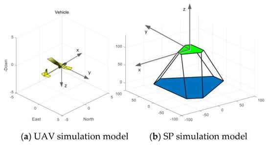 The attitude angle and position in the simulation model are relative to the aircraft body coordinate system Oxbybzb, which is different from the platform’s own coordinate system OxSySzS, and it is shown as follows.
