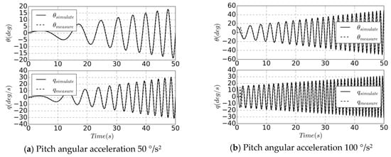 In the acceleration mode experiment, only a single acceleration movement in a certain direction is carried out to verify the limit overload of the aircraft and calibrate the measurement of angular velocity in the dynamic process. When the aircraft is fixed on the platform, this mode can be used to test the limit frequency and amplitude of structural strength. Figure 17 shows the test results under 50 and 100°/s2 angular acceleration, in which the solid line is the input of the upper machine, and the dotted line is the measurement of the flight controller. The delay time of the open-loop experiment is 100 ms, and the closed loop is increased to 500 ms due to the feedback of the controller hardware; so, the acceleration mode requires the system to have a fast response and can only be tested in the open-loop experiment. Results show that the control system can withstand a 100°/s2 vibration, and the pitch angle and angular velocity can be accurately measured. The movement in this mode is gradually divergent, and it can be regarded as an unstable state in practice. In addition, the whole process of oscillation divergence can be reproduced by the experiment.