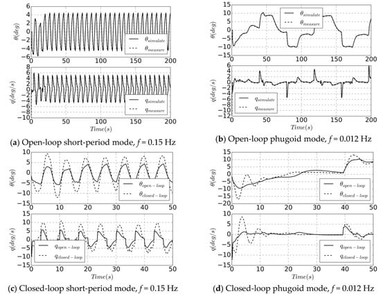 Figure 18a,b shows that SP can achieve an accurate tracking of pitch angle; there is a small error in pitch angular velocity tracking, and the attitude angle input is consistent with the measurement. In the closed loop as shown in Figure 18c, as the measurement state feedback to the upper machine, the amount of calculation becomes larger, and the motion exhibits a certain delay. The experiment frequency of the closed loop is the same as that of the input, but the amplitude increases by nearly 30%. Combined with Figure 18d, the closed-loop experiment also shows that the amplitude increases obviously in the state change process. Compared with the numerical simulation, the dynamic process of the state change in practice will have a certain delay, and the amplitude will be enlarged or reduced. By adjusting the dynamic characteristics of the SPHIL, such as adding a given delay process or amplitude limit to the acceleration or velocity of the platform, it can reproduce the actual motion characteristics and reduce the gap between the numerical simulation and the real flight.