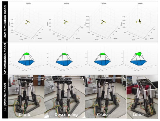 Before implementing the control system on the UAV, the whole system needs to be verified by simulations, including a numerical nonlinear model and hardware-in-the-loop (HIL) validation. The numerical simulation is used to justify the whole platform, aerodynamic, energy, and control system, and to test each phase and state-switching process via a typical mission route [26]. After the numerical simulation verification, combined with the control system hardware and a 6-DOF motion platform, an HILS system is established for typical flight modes, sensor measurement, and control logic.