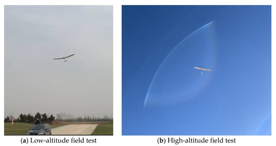 The above simulation process is a preliminary and a laboratory test of the whole system; due to the lack of position and velocity information, a field test is necessary for the whole system verification. The target mission areas of the UAV are Qiangtang and Hoh Xil, Tibet, the flight conditions are high altitude, low temperature, low pressure, and limited flight area, and the field test flight is divided into two stages of low and high altitude to fully verify the design scheme and compare the difference caused by high altitude in detail. To ensure the experiment consistency, the power and payload conditions of UAV are the same in the two experiments. The low-altitude test site was located in Xi’an (34.033 E, 109.100 N) with a height of 635 m, the time was November 29, 2018, 13:00, and the temperature was 6 °C; the high-altitude test was in Qiangtang (31.988 E, 87.317 N) with a height of 4554 m, and it was at the time the same as the numerical simulation. The temperature difference due to the altitude difference was approximately −15 °C during winter, the take-off speed increased from 8.5 to 11.5 m/s, and the cruise speed increased from 10 to 11.5 m/s.