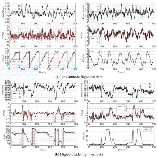 Simulation and model correction are mutually reinforcing processes. The former is to predict the final result through a general rule, and the latter is a reverse process to ensure that the prediction result is more in line with the actual situation [29]. After the field test, the flight data can be used to verify the correctness of the system model and to calibrate the key parameters of the modeling. Using the parameters in the cruise state as a reference, the flight data can be used to calibrate the longitudinal lift-drag model, sensor, and state estimation module.