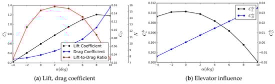 The longitudinal lift, drag coefficient curves, and elevator influence are shown in Figure 22, and the effect of the elevator on lift and drag is calculated by its derivatives, CLδe and CDδe. The design point of the maximum lift-to-drag ratio is 0 to 4 degrees angle of attack, and the UAV cruises in this state. Considering the cost of the experiment, no airflow angle sensor is installed in the control system.