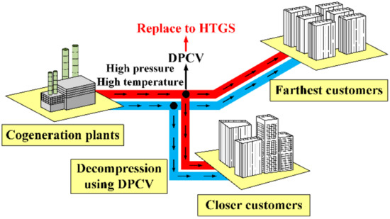 The district heating system (DHS) is known to be efficient and reliable for heating and cooling buildings in densely populated cities, communities, and commercial facilities [1,2,3]. It supplies high pressure and temperature fluids to customers, as shown in Figure 1. However, because the pressure of fluids is decided relative to the distance from the cogeneration plant to the farthest customers, an additional device is required to decompress fluids that are supplied to customers that are closer the plant. Generally, a differential pressure control valve (DPCV) is used to supply fluids, depending on the distance between the cogeneration plants and customers [4]. It can control the differential pressure between the input and output of DPCV.