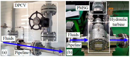 However, in case the DPCV is exposed to high-pressure and temperature fluids over a long time, it increases the probability of cavitation, which can cause heat-loss and decreases the transfer efficiency of heat energy. Therefore, to solve the problem of DPCV in DHS and to utilize excess energy, the hydraulic turbine generation system (HTGS) as a replacement for DPCV has been studied [5]. Figure 2 shows the comparison of pressure regulation devices for high-pressure fluids in DHS. In DHS using DPCV as shown in Figure 2a, the pressure of high-pressure fluids flowing into the pipeline is decompressed by regulating flow rate using the DPCV. In DHS replacing DPCV with HTGS as shown in Figure 2b, the hydraulic turbine with a permanent magnet synchronous generator (PMSG) is installed in the middle of the pipeline without DPCV. The pressure of high-pressure fluids can be decompressed by controlling the torque of the PMSG coupled with the hydraulic turbine.
