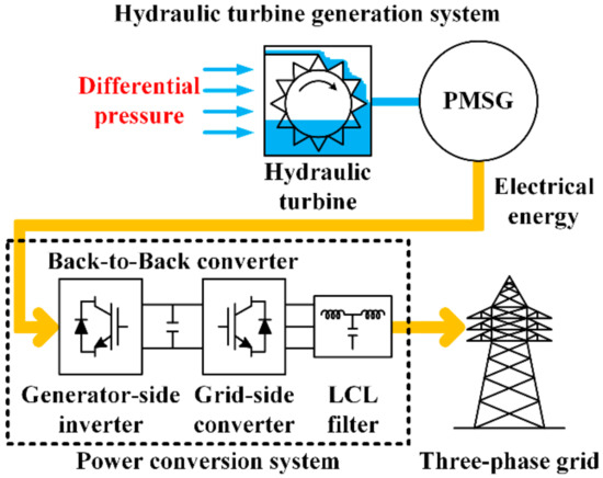 The HTGS consists of a permanent magnet synchronous generator (PMSG) with a hydraulic turbine and a power conversion system (PCS) using a back-to-back (BTB) converter, as shown in Figure 3. Furthermore, an LCL filter for reducing the output of current ripples and a three-phase grid were connected to the PCS. The BTB converter consists of a generator-side inverter and grid-side converter [13,14,15,16] using two-level topologies [17,18] that share a DC-link. In HTGS, electrical energy is generated by the PMSG, when high-pressure fluids rotate the hydraulic turbine. This electrical energy can be transferred to the three-phase grid using the PCS [19,20,21,22]. As a result, HTGS performs differential pressure control of fluids, replaces DPCV, and converts unused energy wasted by DPCV to electrical energy.