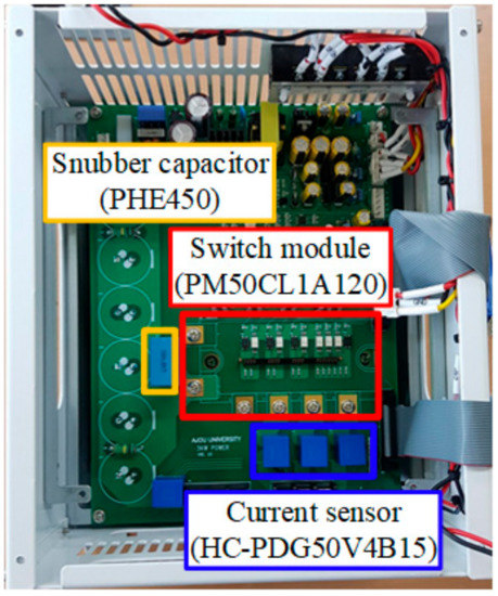 Figure 4 shows the power board of the generator-side inverter. The power board of the generator-side inverter is typically designed by using a switch module of the two-level topology, a snubber capacitor, a DC-link voltage sensor, current sensors, and DC-link capacitors. The switch module is designed by PM50CL1A120 (1200 V/50 A) from Mitsubishi; the module consists of six insulated gate bipolar transistors (IGBTs), gate drivers, and protection circuits. The current sensors are required to measure the currents of the PMSG, and they are designed by HC-PDG50V4B15 (50 A) from KOHSHIN. Additionally, the snubber capacitors are required to reduce spikes in DC-link current and voltage, and to reduce the electromagnetic interference (EMI) caused by voltage damping and current ringing. It is designed by PHE450 (1600 V/330 nF) from KEMET. Finally, the DC-link of the power board in the generator-side inverter is connected to that of the power board in the grid-side converter, and the DC-link voltage sensor measures the DC-link voltage.