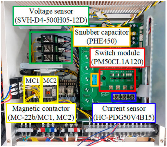 Figure 5 shows the power board of the grid-side converter. The switch module, current sensors, snubber capacitor, DC-link capacitors, and the DC-link voltage sensor of the power board in the grid-side converter are equal to those of the power board in the generator-side inverter. However, because the power board of the grid-side converter is connected to the three-phase grid, additional components, such as voltage sensors and magnetic contactors (MCs), are required. The voltage sensors are required to measure the voltages of the three-phase grid; they are designed by SVH-D4-500H05-12D (1000 V) from Seri2B. Additionally, the MCs are required to connect the power board of the grid-side converter to the three-phase grid. They are designed by MC-22b (690 V/40 A) from LSIS.