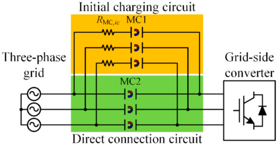 Figure 6 shows the circuit diagram of MCs in the power board of the grid-side converter. The MCs branch out into two types, namely MC1 for initial charging circuit and MC2 for direct connection circuit. Furthermore, the resistors (RMC,ic) are connected to the initial charging circuit in series. Therefore, when the power board of the grid-side converter is initially connected to the three-phase grid, MC1 is switched on to prevent the inrush current of DC-link capacitors. After a few seconds, MC2 is switched on for a direct connection between the power boards of the grid-side converter. Then, MC1 is switched off.