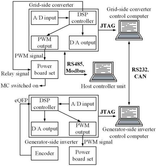 Figure 8 shows a functional block diagram of the control board with a host controller unit. In the proposed hardware-simulator, the JTAG of SDS200i from Syncworks is used to connect the control board to the computer. The controller area network (CAN) communication, which exchanges information between each control board of the generator-side and grid-side converter, uses RS232 for serial communication. The relay signals and RS485 are only used in the control board of the grid-side converter. The relay signals are used to operate the MCs, as shown in Figure 6. RS485 is used for Modbus communication to exchange start or stop signals for the operation of the PCS between the control board of the grid-side converter and the host controller unit. The eQEP is used only in the control board of the generator-side inverter and to calculate the rotational angle and speed of the PMSG. Finally, there are other peripheral circuits for isolation circuits and protection circuits.