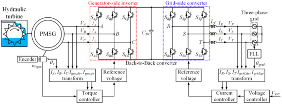 Figure 9 shows the control block diagram of HTGS with the BTB converter. In HTGS, the electrical energy generated from the PMSG as an alternating current (AC) power is converted to direct current (DC) power using the generator-side inverter [25]. The converted DC power is reconverted to the AC power by the grid-side converter. The DC-link reduces the ripple of converted DC power. The control strategies of HTGS is described by dividing the generator-side inverter and grid-side converter [26,27]. The generator-side inverter controls the torque of the PMSG to perform differential pressure control of the high-pressure fluids. Moreover, the grid-side converter performs the DC-link voltage and current control [28]. As a result, the DC-link voltage of the BTB converter is continuously controlled, and the power generated by differential pressure control is transferred to the three-phase grid.