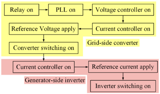 Figure 10 shows the control sequence of HTGS with the BTB converter. First, in the grid-side converter, the relay signal is switched on to operate the MCs as shown in Figure 6 and to connect the power board of the grid-side converter to the three-phase grid. Then, phase-locked loop (PLL) control is performed to calculate the phase angle of the three-phase grid. If the PLL control is operated appropriately, the voltage controller and current controller are turned on, and the reference DC-link voltage is applied. Finally, the switching operation of the grid-side converter is performed. The DC-link voltage controlled by the grid-side converter is applied to the DC-link of the power board in the generator-side inverter because the DC-link of the power board in the grid-side converter is directly connected to that of the power board in the generator-side inverter. Then, in the generator-side inverter, the current controller is turned on, and the reference current of the PMSG is applied. Finally, the switching operation of the generator-side inverter is performed.