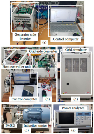 In this study, the proposed hardware-simulator for HTGS was built, as shown in Figure 11. The proposed hardware-simulator consists of the generator-side inverter, the grid-side converter, a grid-simulator, the PMSG connected with an induction motor, and a power analyzer. Table 1 shows the PMSG and system parameters used for the proposed hardware-simulator.