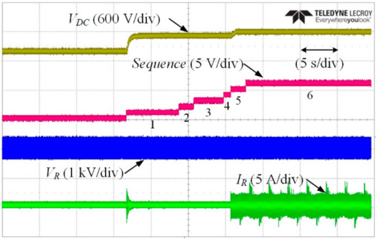 Figure 12 shows the experimental results of the voltage control, using the grid-side converter with a control sequence. The state of the control sequence (Grid-side sequence) is changed to 6 from 0 depending on the control sequence of the grid-side converter, as shown in Figure 10. The DC-link voltage (VDC) is kept constant at 600 V using the voltage control of the grid-side converter. Additionally, VR and IR indicate the R-phase voltage and current of the three-phase grid, respectively. In Grid-side sequence 1, the MCs are operated to connect the initial charge circuit or direct connect circuit, depending on the relay signals. In Grid-side sequence 2 and 3, PLL control is performed to calculate the phase angle of the three-phase grid, and the calculated phase angle is checked, respectively. If the PLL control is typically operated, in Grid-side sequence 4, the voltage and current controller are turned on, and the reference DC-link voltage is adjusted to 600 V. Finally, in Grid-side sequence 5, the switching operation of the grid-side converter is performed. In Grid-side sequence 6, the overall control of the grid-side converter is checked.