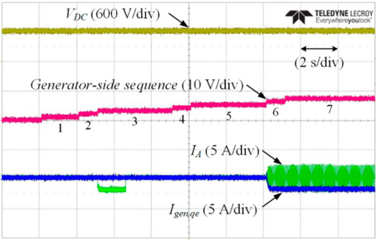 Figure 13 shows the experimental results of the current control, using the generator-side inverter with a control sequence after the voltage control using the grid-side converter. The state of the control sequence (Generator-side sequence) is changed to 7 from 0 depending on the control sequence of the generator-side inverter, as shown in Figure 10. IA and Igen,qe indicate the A-phase current and q-axis current of the generator-side inverter, respectively. In Generator-side sequence 1, VDC of the generator-side inverter shared with the DC-Link of grid-side converter is checked. In Generator-side sequence 2 and 3, the PMSG is aligned by applying d-axis current. In Generator-side sequence 4, the current controller is turned on and the reference current is applied. Thereafter, the induction motor which modeled hydraulic turbine is rotated using Yaskawa A1000 in Generator-side sequence 5. If the PMSG connected to the induction motor rotates with constant speed, the switching operation of the generator-side inverter is performed. Finally, in Generator-side sequence 6 and 7, the overall control of the generator-side inverter is checked.
