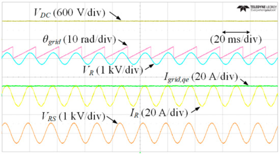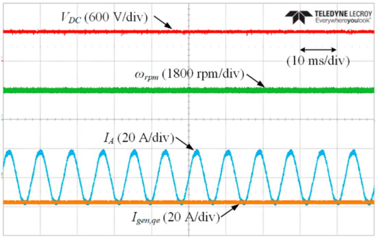 Figure 14 shows the experimental results of the voltage and current control using the grid-side converter. The phase angle (θgrid) of the three-phase grid is calculated by the PLL control and it can be checked by comparing it with the phase angle of the VR. The VDC is kept constant at 600 V, and the q-axis current (Igrid,qe) of the three-phase grid is controlled to 10 A, which is determined by the power generated from the PMSG. Additionally, as shown in Figure 14, the grid-side converter has a unity power factor because the phase difference between VR and IR is almost zero.