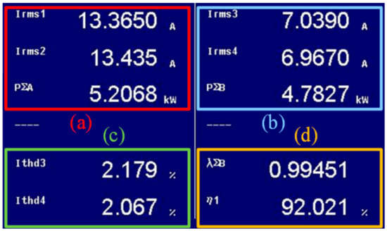 Experimental results of BTB converter performance, using power analyzer. (a) Current and power of PMSG; (b) current and power of three-phase grid; (c) current THD of three-phase grid; (d) power factor and efficiency of BTB converter.