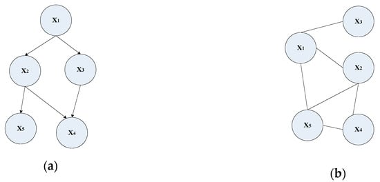 Representation. This is the fundamental and critical factor for a PGM framework and includes directed graphical models (Bayesian networks in Figure 1a) and undirected graphical models (Markov Random Fields in Figure 1b). In general, a PGM defines a family of probability distributions that can be represented in terms of a graph. Nodes in graph correspond to random variables X1, X2, …, Xn; the graph structure translates into statistical dependencies (among such variables) that drive the computation of joint, conditional, and marginal probabilities of interest. For example, in Figure 1a, the joint probability or Bayesian factorization is described by the conditional probabilities in Equation (1) as follows: