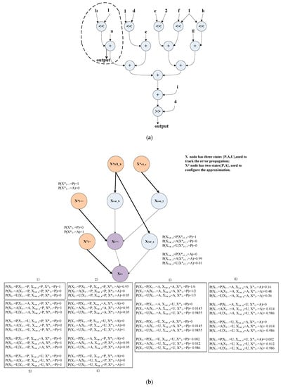As Figure 2 shows, the workflow of HEAP is also composed of three steps. The given input data flow graph (DFG) of specified application is firstly converted to a heterogeneous Bayesian network by mapping rules. It is noted that, if the data flow graph is not given directly, open source tool Low Level Virtual Machine (LLVM) can compile the application C/C++ source code and provide DFG through intermediate representation (IR) []. Based on an available DFG, a Bayesian network is constructed through the simple mapping rules. Keep the variable nodes with three states {P = precise, A = approximate, U = unacceptable}, which uses the same handling policy in [,]. For example, X1+ denotes the left sum of a and shift temporary. It has three possible states {P, A, U}. To configure the multiple approximate sources, the two states {P = precise, A = approximate} nodes are inserted. For example, X*1+ becomes a new parent of X1+ as a new two states node. More details about the representation are depicted in Section 3.3.1.