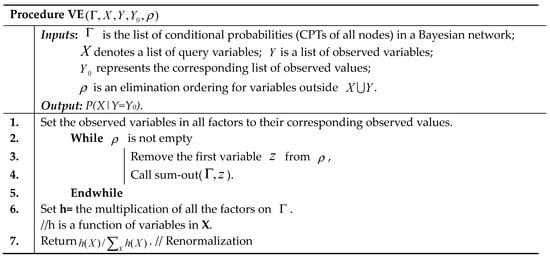 The detailed algorithm description is shown in Figure 5, including four inputs: The conditional probability table of nodes, that is, the CPTs of all nodes, the observation node X, and the query node list Y, where Y0 is the observation value corresponding to Y; elimination order; the output is the edge probability P (X|Y = Y0). More descriptions and accuracy proofs of the VE algorithm can be found in the literature []. The complexity of VE can be measured by the number of times of numerical multiplication and numerical addition. An optimal elimination order can bring the lowest complexity, but how to find the optimal elimination order itself is still an NP problem. In this paper, the VE algorithm uses the topological order that the PGM structure depends on as the elimination order.