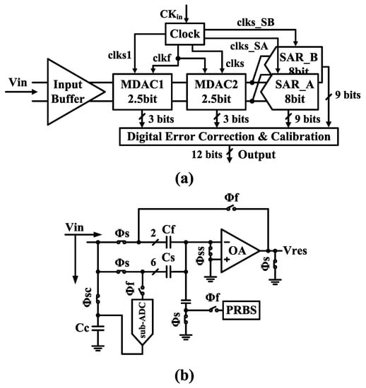 (a) Proposed pipelined/successive-approximation-register (pipelined/SAR) hybrid analog-to-digital converter (ADC). (b) Block diagram of the flip-around multiplying digital-to-analog converter (MDAC) used in this hybrid ADC. The PRBS is used to assist the capacitor mismatch and inter-stage gain calibration.