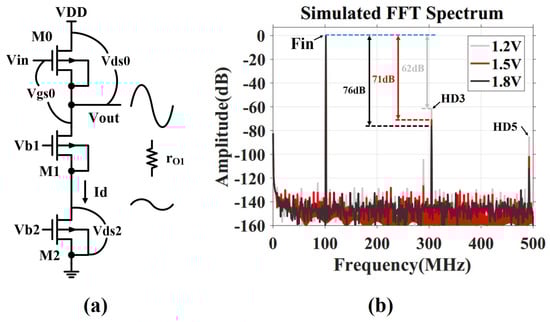 The differential input buffer is optimized at different power supply via simulation. Figure 3b shows the fast Fourier transform (FFT) spectrum for Vout with a 101 MHz input signal at different power supply. With a power supply of 1.8 V, 76 dB spurious free dynamic range (SFDR) can be achieved. The linearity deteriorates as the power supply decreases. Especially M1 may enter the triode region when power supply drops to 1.2 V, where the Vds2 becomes sensitive to the Vout variation.