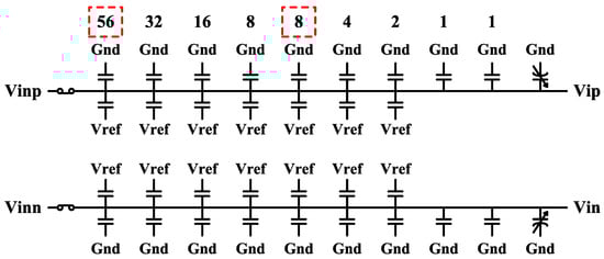 Figure 6 shows the CDAC array for splitting monotonic switching scheme [] used by this SAR quantizer. To relax the settling time of the MSBs, the original 64-unit cells are split into 56-unit cells and 8-unit cells. And the 8-unit cells are inserted before the 4-unit cells as the redundant cycle. Then all even number of unit capacitors are split into two identical sub-capacitors. In the sampling phase, the bottom plate of half sub-capacitors are reset to Vref for each side, and the others are reset to ground as shown in Figure 6. At the same time, the input signal is sampled on the top-plate of the capacitors in the CDAC, where the first comparison can be performed immediately without switching capacitors, saving overall conversion time and 50% total capacitance. This is critical to achieve a low power consumption for the MDAC2. Next, when the conversion phase arrives, the comparators start to perform the comparison. According to the comparison results, the sub-capacitors on the higher voltage potential side are all connected to ground and the sub-capacitors on the other side are all connected to Vref. As the conversion proceeds to LSB, the switching method in Reference [] is applied to the 1-unit cell. The resulting common-mode variation is negligible.